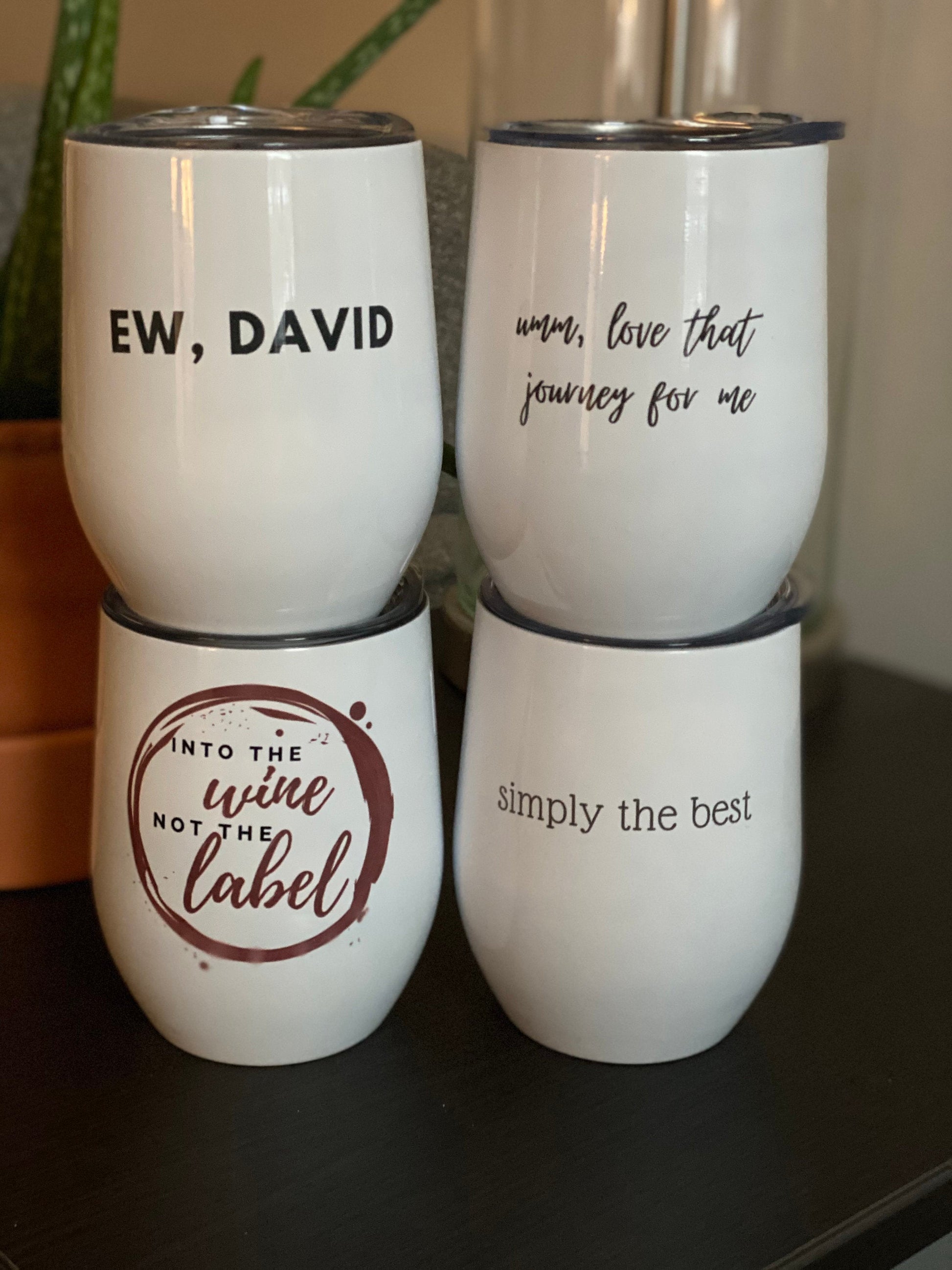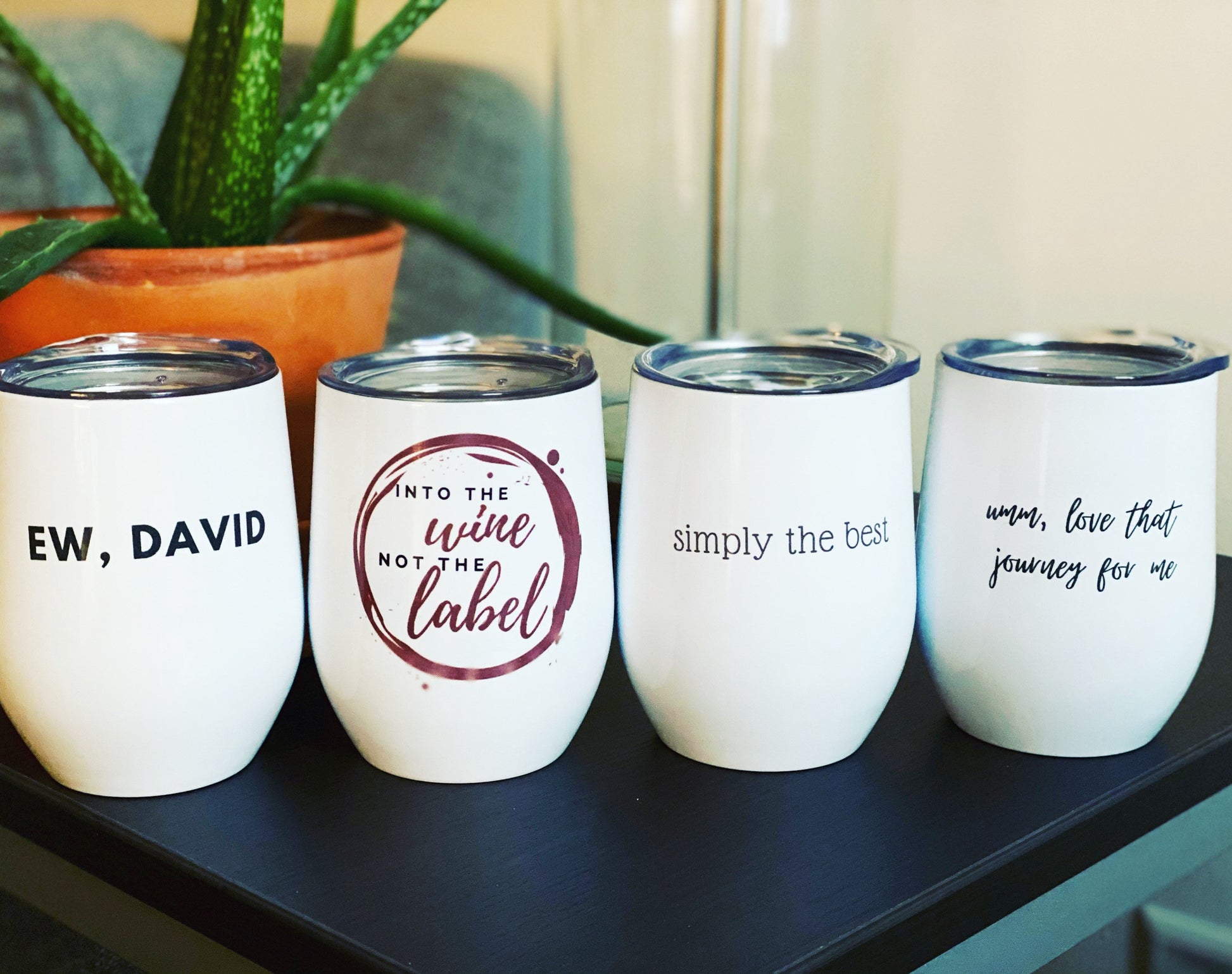 Indulge in luxury with our Schitt's Creek themed stainless steel wine tumbler, the perfect accessory for all aficionados of the Rose family! Each 11oz tumbler, sold individually or in a charming set, lets you embody the essence of Moira and David with every delightful sip.